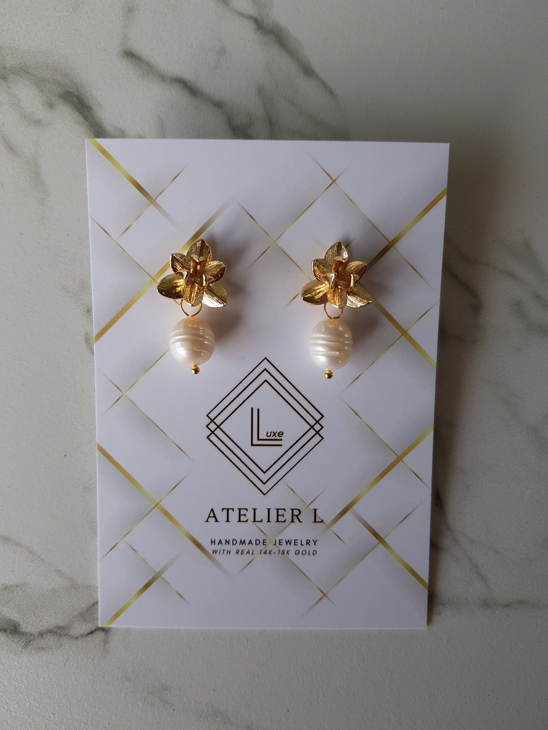 18K vergulde nikkelvrije oorsteker in de vorm van een bloem met daaraan een echte zoetwaterparel.