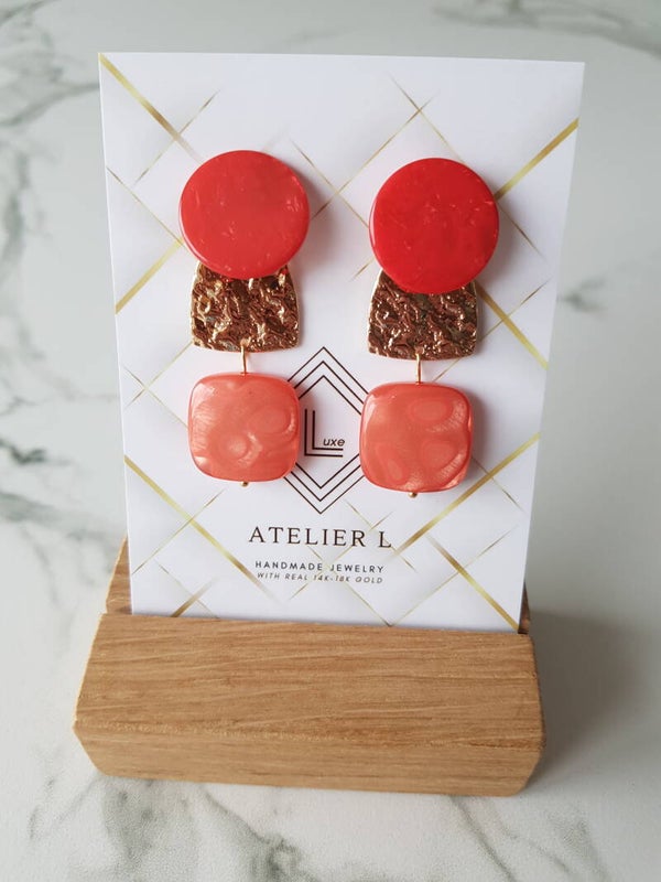 Nikkelvrije 18K vergulde grote oorknop met daaraan een combinatie van 18K vergulde hangertjes en resin.