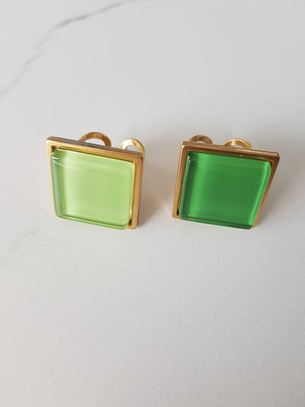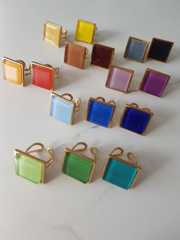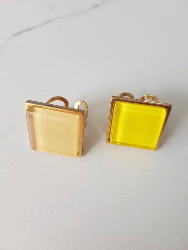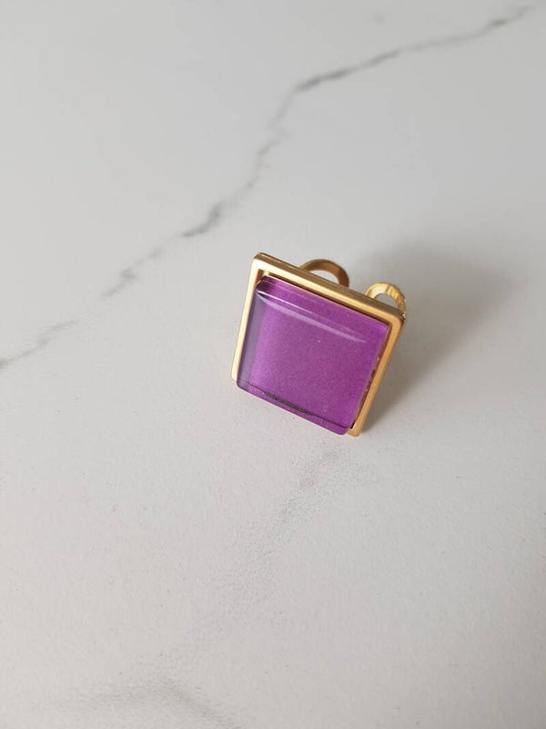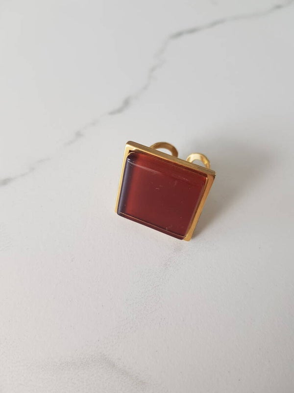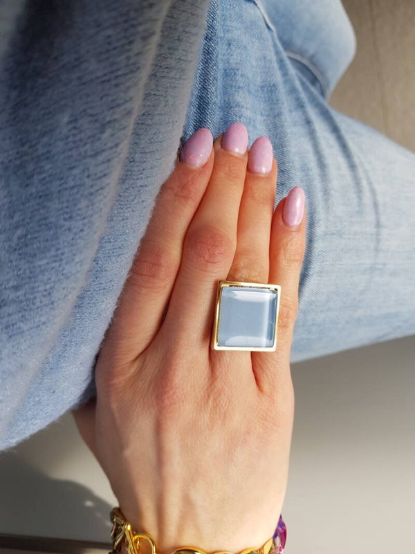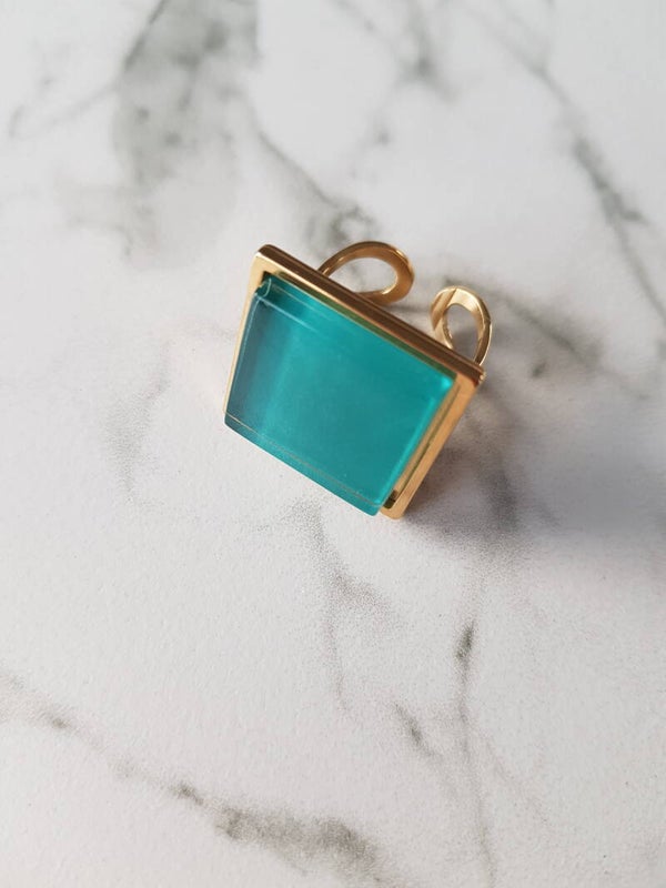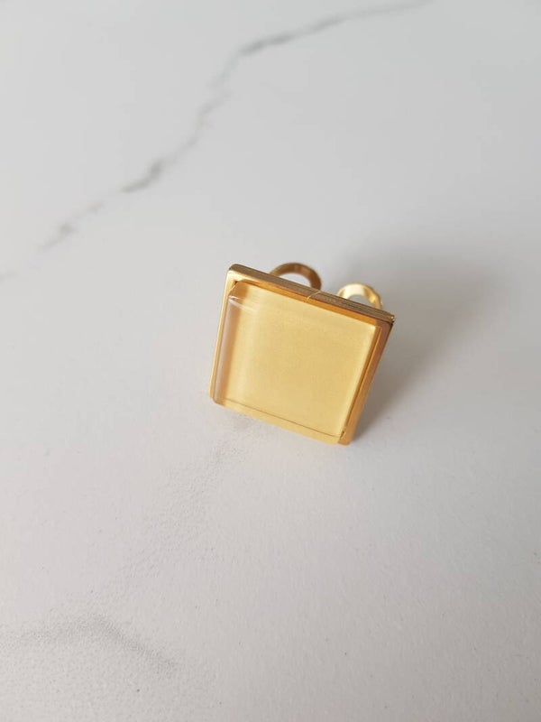 Ring uit 18 karaat verguld stainless steel met vierkante glazen cabochon van 20mmx20mm. De ring is voorzien van een stevige las waardoor hij tegen een stootje kan.