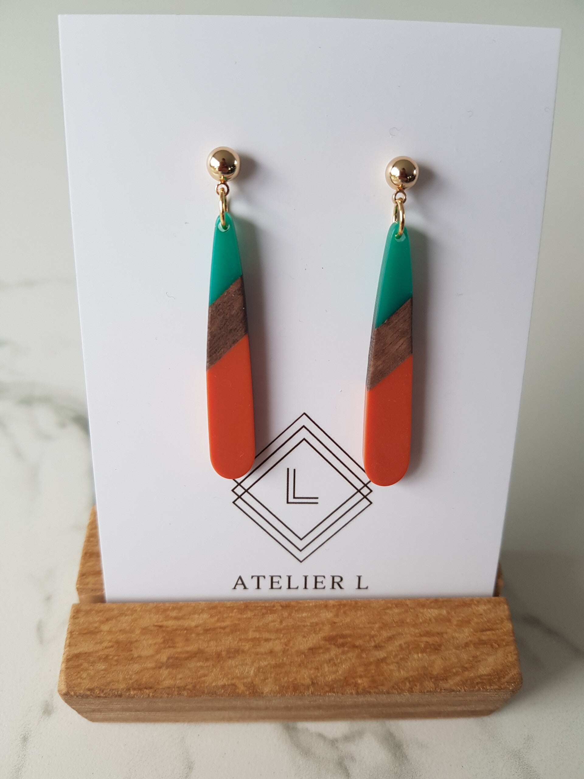 Nikkelvrije oorsteker met hanger uit resin en hout.