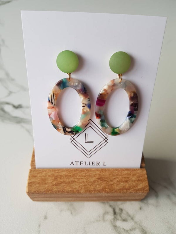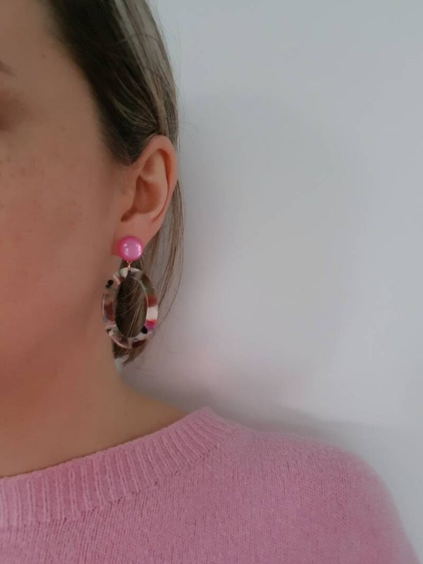 Een combinatie van multicolor resin met nikkelvrij gekleurde oorknop van 12mm. Elke oorbel heeft een unieke tekening.
