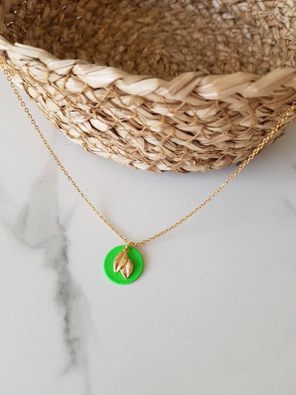 Schakelketting uit verguld stainless steel met 18 karaat vergulde blaadjes hanger en gekleurd schijfje. Liever de vlinder hanger? Kijk naar 'Ketting vlinder'