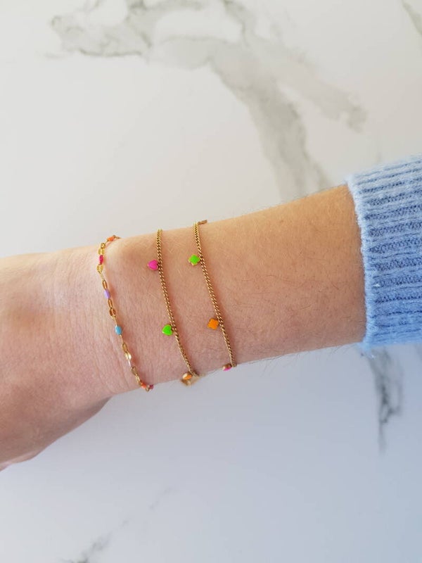 Fijne schakelarmband uit stainless steel met kleine hangertjes in verschillende neonkleuren.
